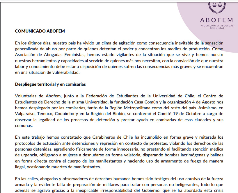 Compartimos el comunicado de la Asociación de Abogadas Feministas de Chile