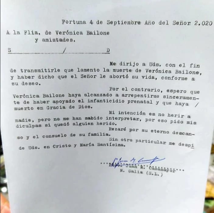 La carta difundida en la noche del viernes comienza “Me dirijo a ustedes con el fin de transmitir que lamento la muerte de Verónica Baiolone, y haber dicho que el Señor le abortó su vida, conforme a su deseo. Por el contrario, espero que Verónica Baiolone haya alcanzado a arrepentirse sinceramente de haber apoyado el infanticidio prenatal y que haya muerto en gracia de Dios”.