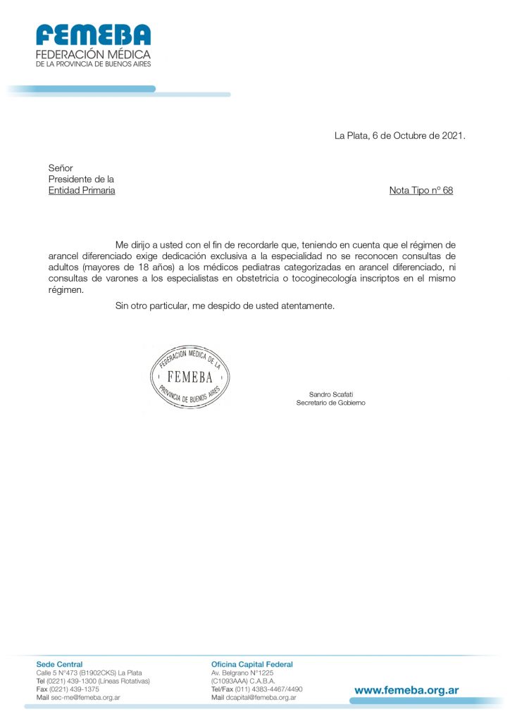 Médiques de la provincia de Buenos Aires recibieron este miércoles, 6 de octubre, una inédita y preocupante notificación de la Federación Médica de Buenos Aires (FEMEBA) sobre la atención de personas trans y no binarias. En la misma se menciona que no serán reconocidas las consultas de adultos (mayores de 18 años) a les pediatras categorizades en arancel diferenciado (cuando según la Organización Mundial de la Salud y el Ministerio de Salud de la Nación, la adolescencia se extiende hasta los 20 años). Tampoco serán reconocidas o dejarán de abonarse las prestaciones en obstetricia o tocoginecología solicitadas por varones, lo que significa la obstaculización o impedimento del acceso a la salud sexual de masculinidades trans y no binaries o intersex que lo requieran.