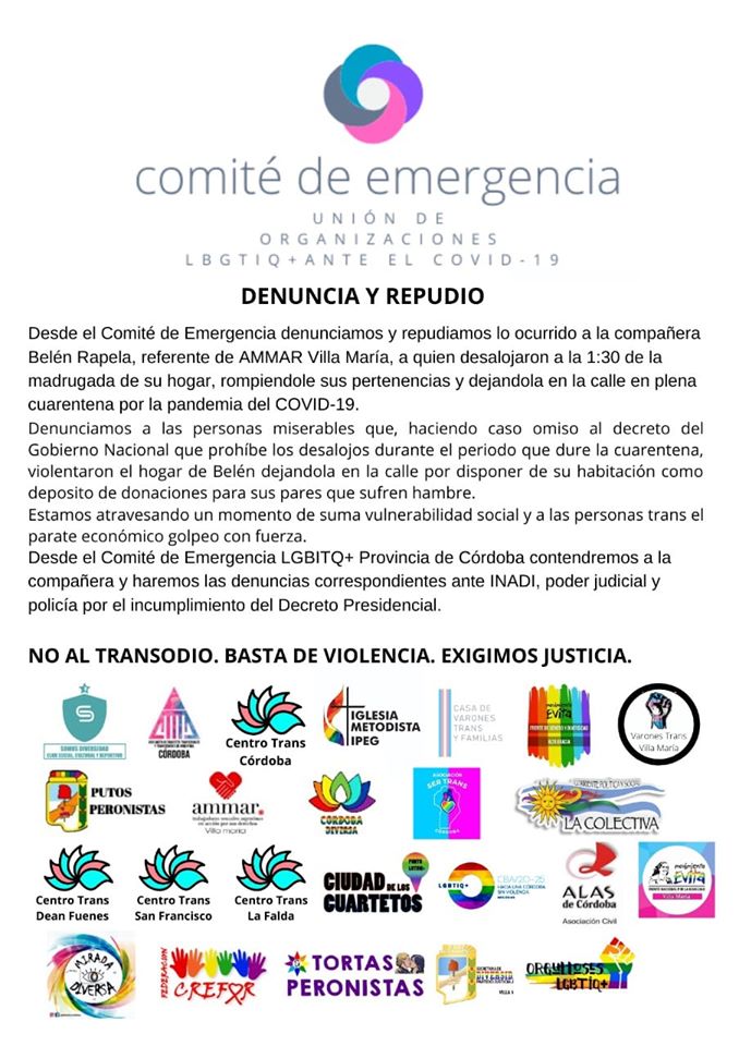 Pero el mismo día que se publicó esa medida, Belén Rapela, mujer trans y referente en la ciudad cordobesa de Villa María de la Asociación de Mujeres Meretrices de Argentina (AMMAR), denunció que la propietaria de la vivienda que alquilaba y su hijo la insultaron, amenazaron y desalojaron por la fuerza. Acompañada por el Comité de Emergencia Unión de Organizaciones LBGTIQ+ ante el Covid-19, formuló la denuncia en una Unidad Judicial y hoy la presentará en el Instituto Nacional contra la Discriminación (Inadi).